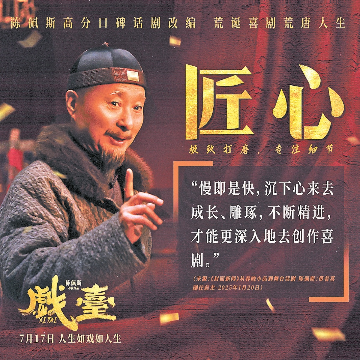 “戏是演给人看的,可剧场装不下所有想看的人。”在电影《戏台》发布的“嬉笑怒骂皆风骨”陈佩斯特辑中,陈佩斯这句话揭开了他将《戏台》从话剧舞台搬上银幕的初心。从春晚舞台为千家万户带来笑声,到如今为话剧和电影奔忙,陈佩斯对表演的热爱几十年如一日,始终保持着孩子般的纯粹、真诚和求知欲,而这也奠定了电影《戏台》的品质,影片由陈佩斯、黄渤、姜武、尹正领衔主演,杨皓宇特邀主演,余少群、陈大愚、徐卓儿主演,尹铸胜友情出演,将于7月17日全国上映。