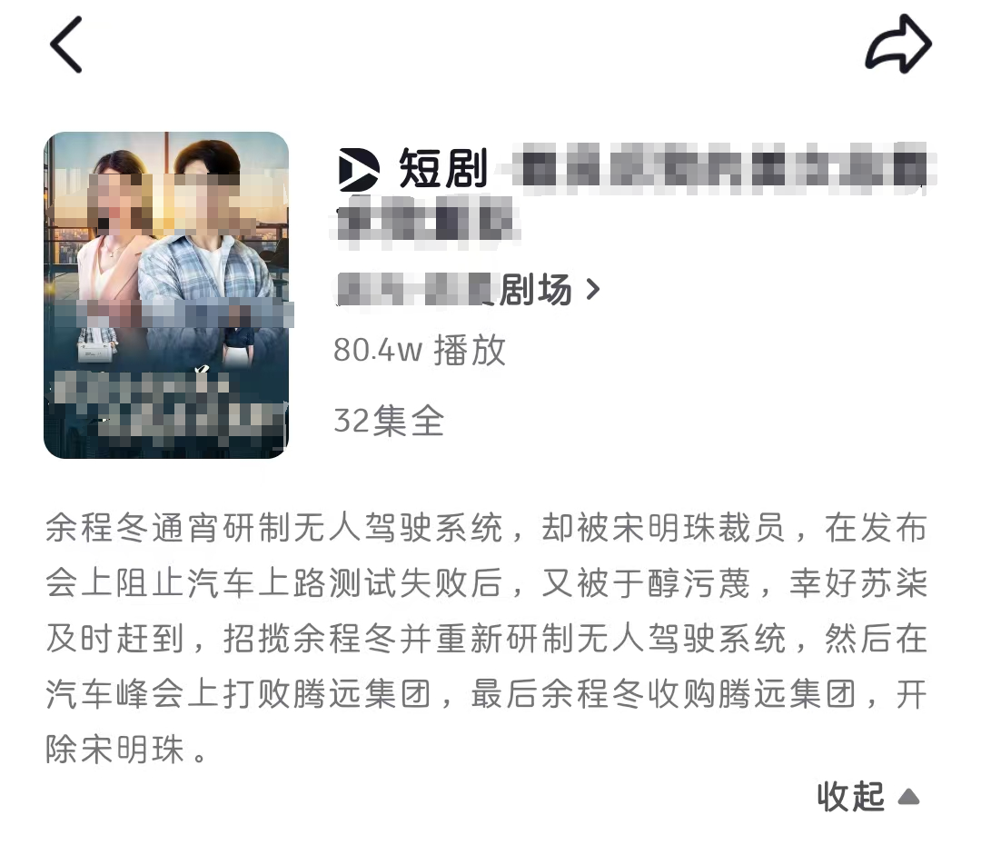 这部微短剧播出于今年六月,热度并不算太高。剧情大概讲述的是腾远集团研发无人驾驶系统的余程冬被宋明珠裁员,之后被骁米集团的董事长苏柒挖角,后来余程冬打败腾远集团并开除宋明珠。