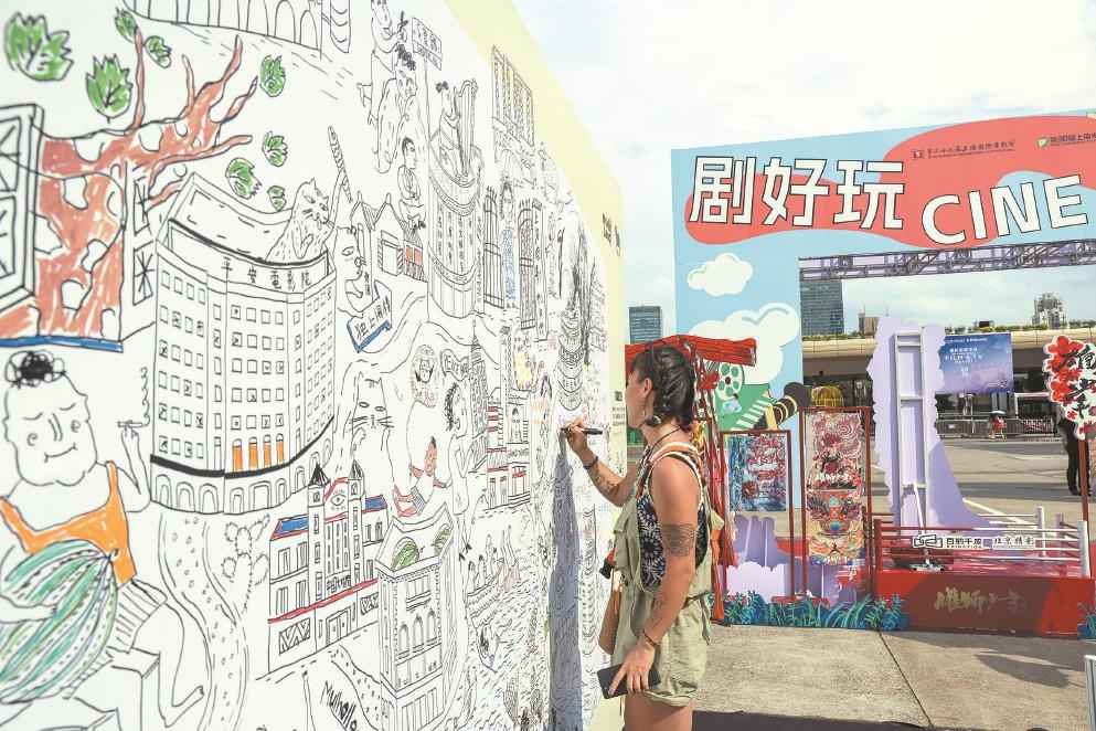 胡子拉碴的警员阿Sir、动画电影《驯龙高手》中的无牙仔、充满悬念的“酱园弄现场”……在上海展览中心,立有一块由插画师Rosá玫瑰与市民共创的“我的电影故事”画板,一笔笔手绘中埋下很多城市彩蛋与弄堂故事,更有影迷在空白插画区记录下自己的“私影史”。画板右上角有一处方方正正的电影院简笔画,连进场路线都用火柴人标注清楚,Movieland小程序工作人员韩语指着这处手绘告诉记者:“一位影迷过来,说‘怎么能没有我们沪北电影院呢?我也要画一个’,他就趴在画板画了快半小时,昨天太阳那么大,背都晒红了。”