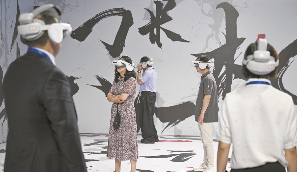 电影节的电影市场活动上,嘉宾观看中国电影科技企业的虚拟影片。 新华社发