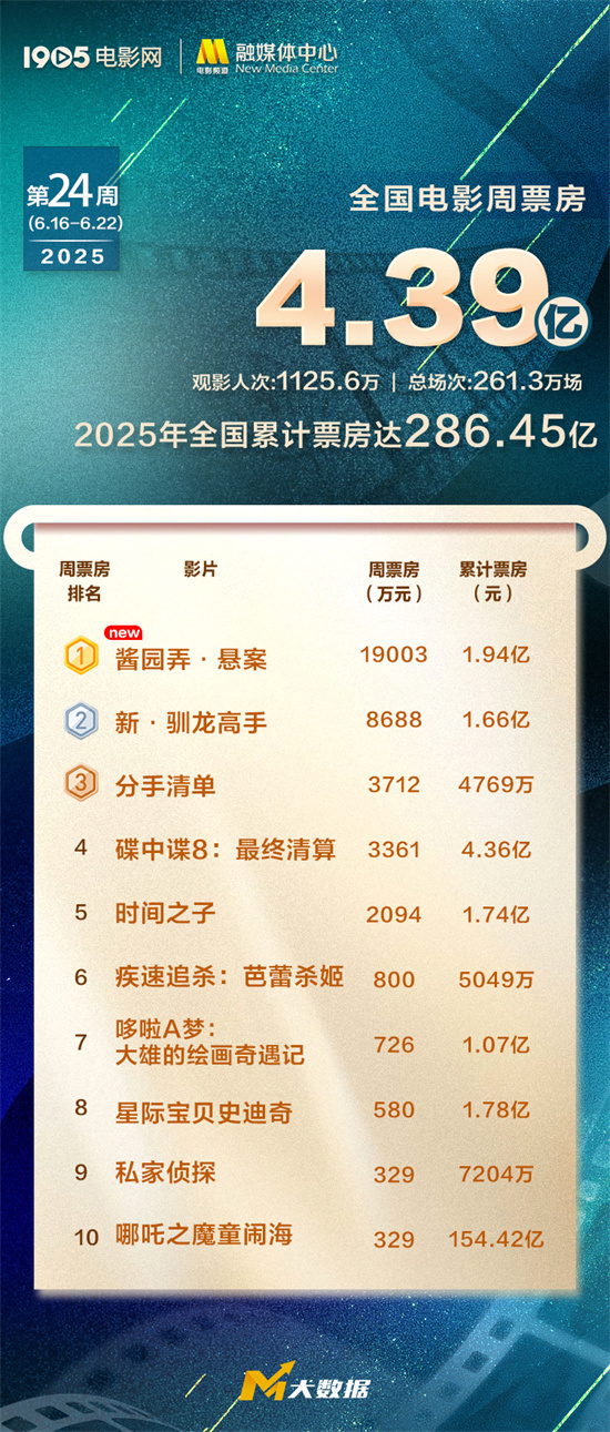 1905电影网讯 2025年第24周(6.16-6.22)全国电影周票房4.39亿元,观影人次超1125万,2025全年电影票房累计286.45亿元。