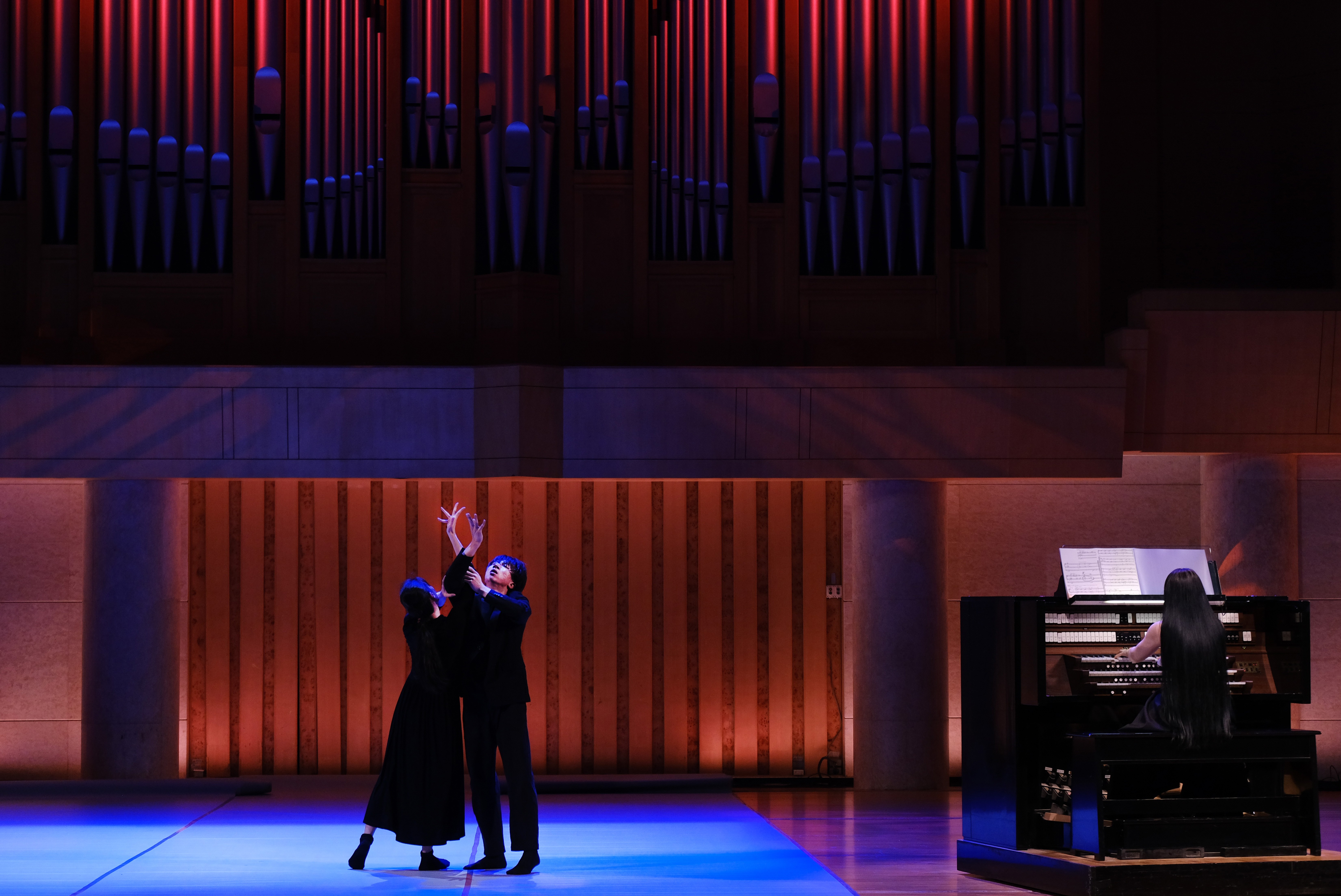9月9日晚,《幻想之翼》风琴·舞蹈音乐会在中山公园音乐堂上演,管风琴演奏家沈媛与舞蹈家王亚彬及亚彬舞影工作室的两位青年舞者,呈现了一场管风琴与现代舞的跨界对话。