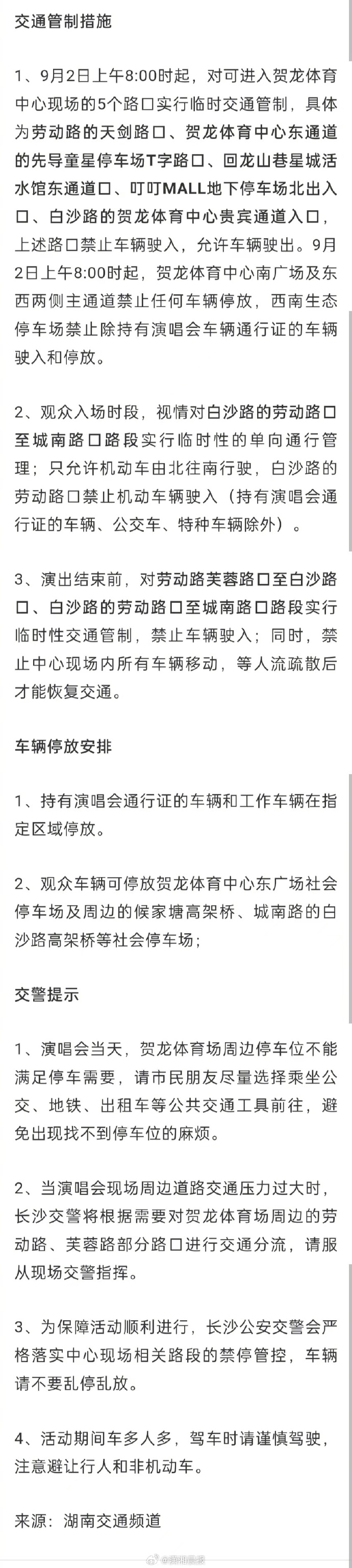 2023年9月2日19:30—22:30时,2023蔡依林巡回演唱会(长沙站)将在贺龙体育中心举行,届时将有3万余名观众到场观看演出。为确保周边道路交通畅通,守护人民群众安全出行,长沙公安交警将采取交通管控措施。