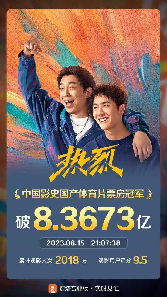 新浪娱乐讯 8月15日,据灯塔专业版实时数据,影片《热烈》票房突破8.3673亿,超过影片《夺冠》票房,成为中国影史国产体育片票房冠军!本片由大鹏执导,黄渤、王一博领衔主演,正在热映中!