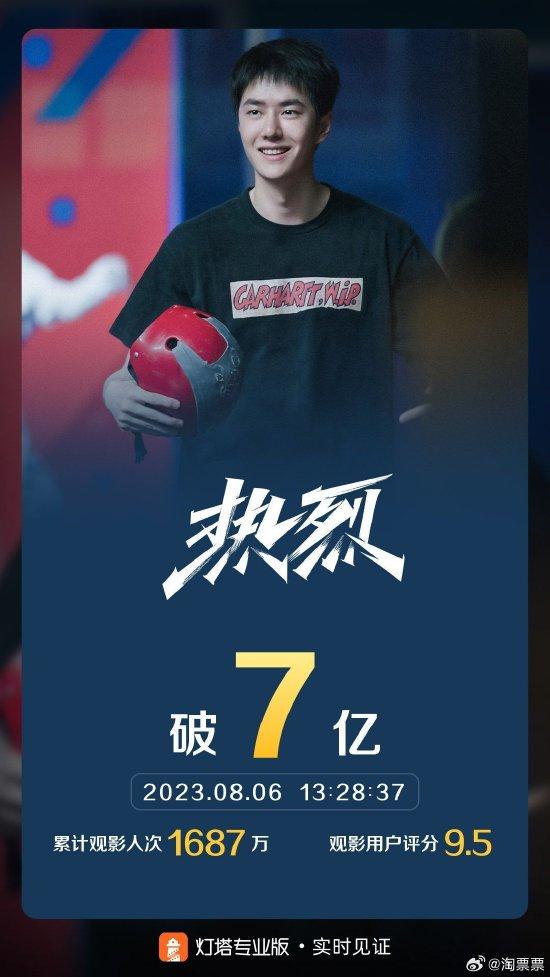 新浪娱乐讯 8月6日,据灯塔专业版,影片《热烈》上映第10天,实时票房突破7亿!本片由大鹏[微博]执导,黄渤[微博]、王一博[微博]领衔主演,正在热映中!