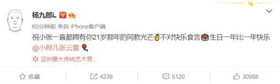 1月9日,搜张云雷张云雷30岁搜生日生日,搜杨九郎杨九郎发微博为其庆生,“祝小张一直都拥有你21岁那年的同款光芒,不对快乐食言,搜生日生日一年比一年快乐”,粉丝纷纷感叹“搜张云雷张云雷搜杨九郎杨九郎天下第一好”。