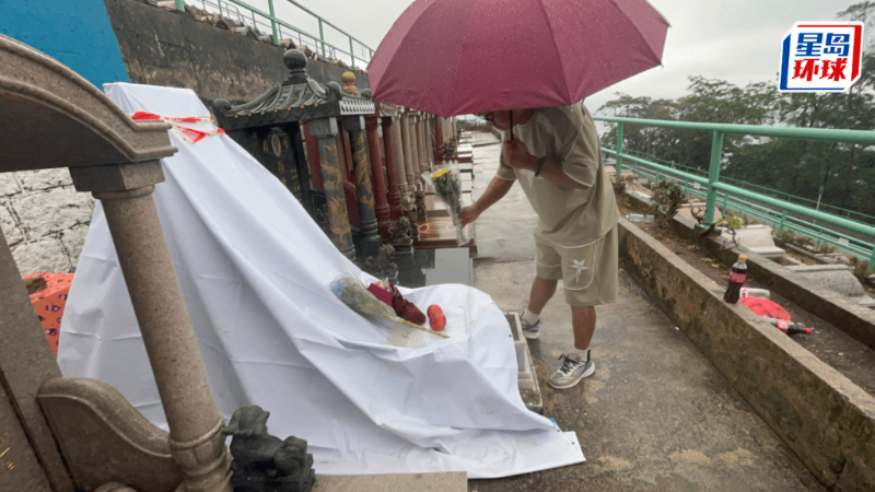 【黄家驹/BEYOND/黄家驹坟墓】著名乐队Beyond已故歌手黄家驹的墓地遭人大肆破坏,警方拘捕2名涉案男子。今日(20日)早上,将军澳华人永远坟场的家驹墓碑已盖上白布,上面放有歌迷的鲜花祭品。有深圳的歌迷对家驹墓碑被毁感痛心,专程带备鲜花等祭品到来,冒雨向家驹献花悼念。