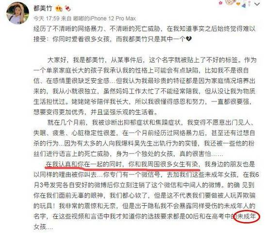 7月18日,最近一段时间一直在爆料吴亦凡的都美竹,接受采访时进一步透露,吴亦凡以各种方式物色、诱骗年轻女性发生关系,包括自己在内的受害者远超8人,其中包括2名未成年女生;她已经分批退回50万元的所谓“封口费”,并做好了走法律程序的准备。